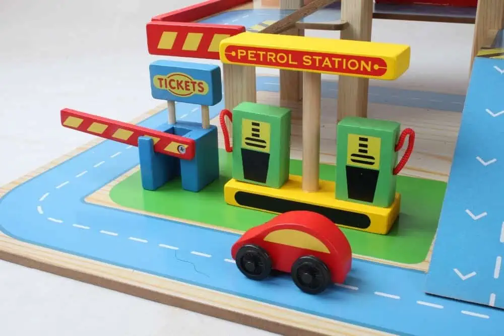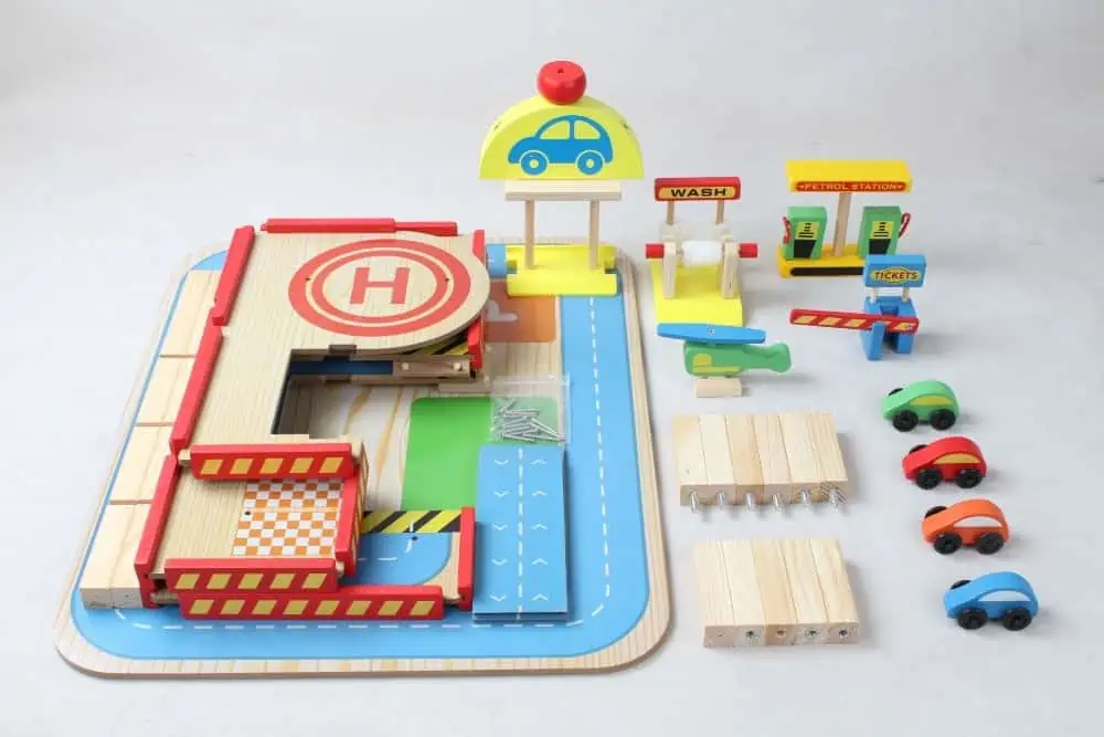 Partagez des moments ludiques avec ce garage voiture bois jouet.