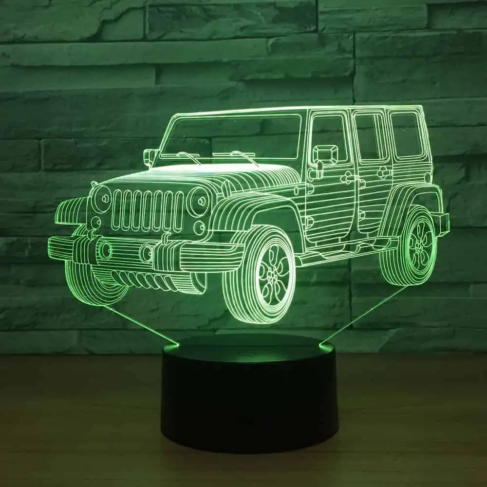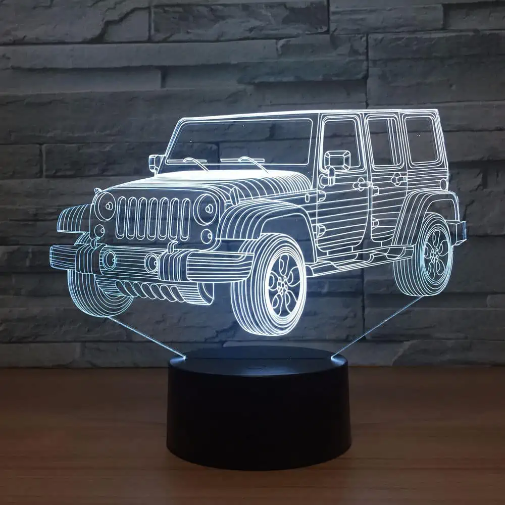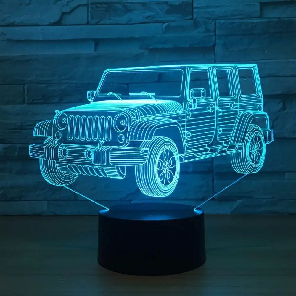 La veilleuse 3D 4×4 est un éclairage décoratif original qui apporte une ambiance chaleureuse et moderne à toute pièce. Sa conception en 3D reproduit fidèlement la forme d’un véhicule tout-terrain, offrant un effet visuel saisissant qui plaira aux amateurs d’automobiles et aux enfants.